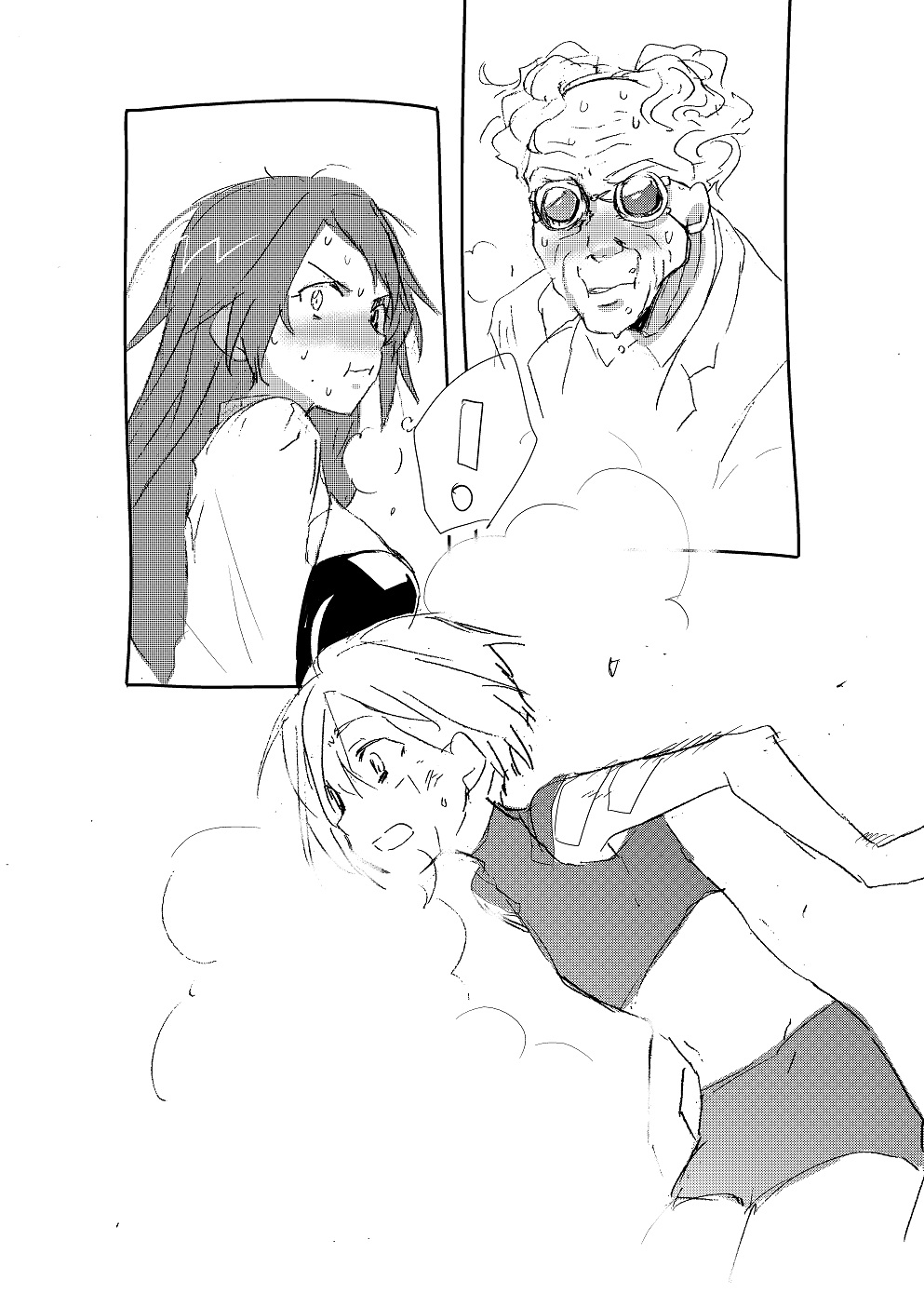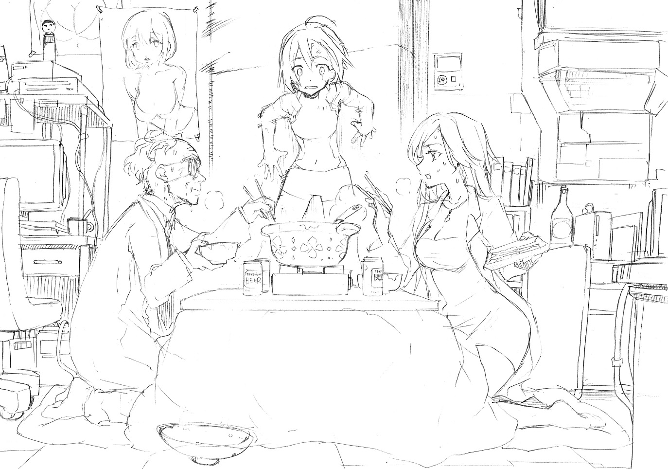 ラボで鍋してるハカセと助手。仕掛け扉で向こう側から侵入してしまったショタロボ。